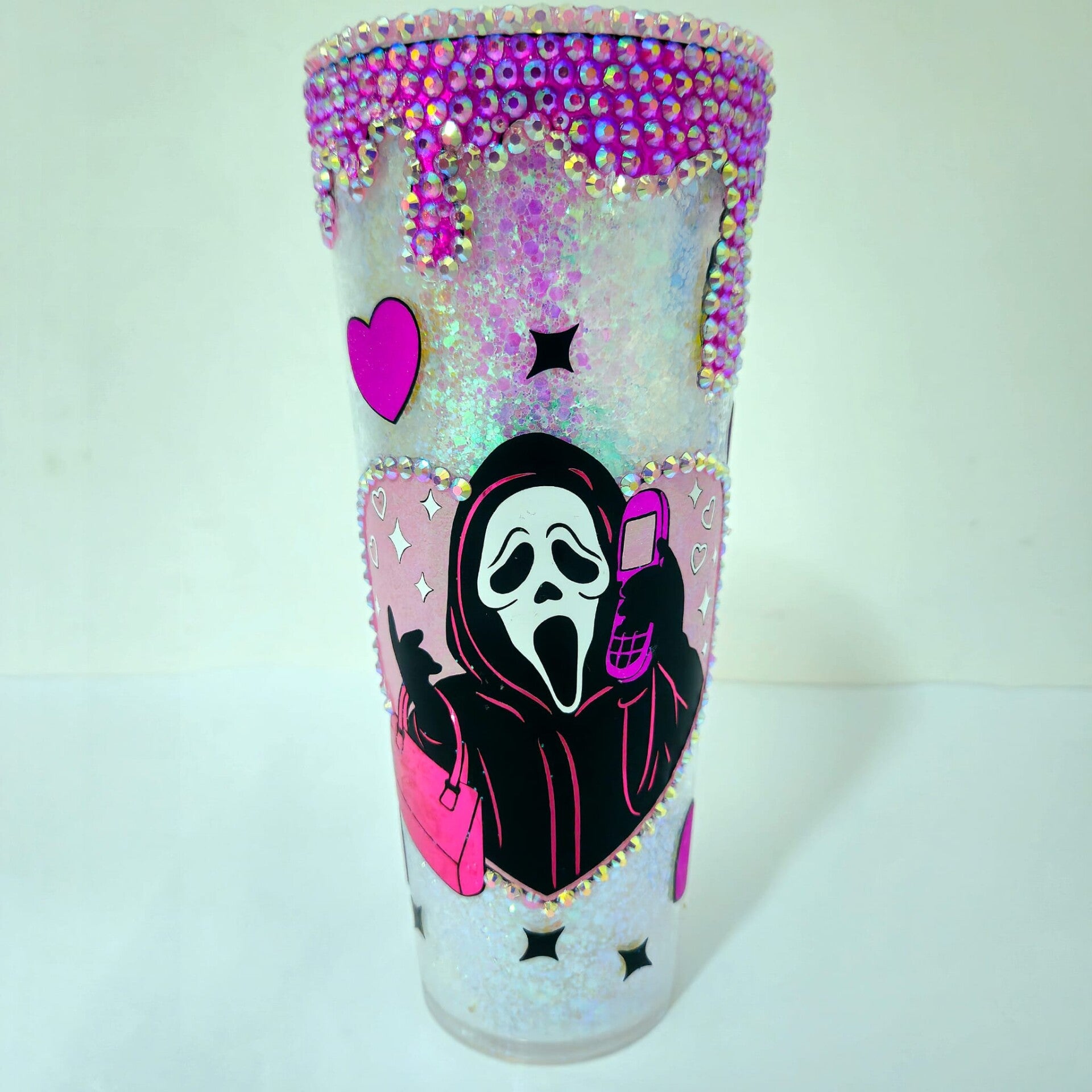 24oz acrylic ghostface/scream glitter noglobe with Rhinestone drip, glitter lid and a rhinestone edge lid. Each AB rhinestone has been individually placed by hand, adding a touch of Glitz to this horror design tumbler.