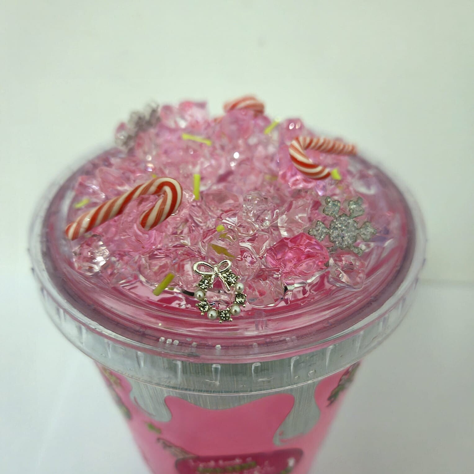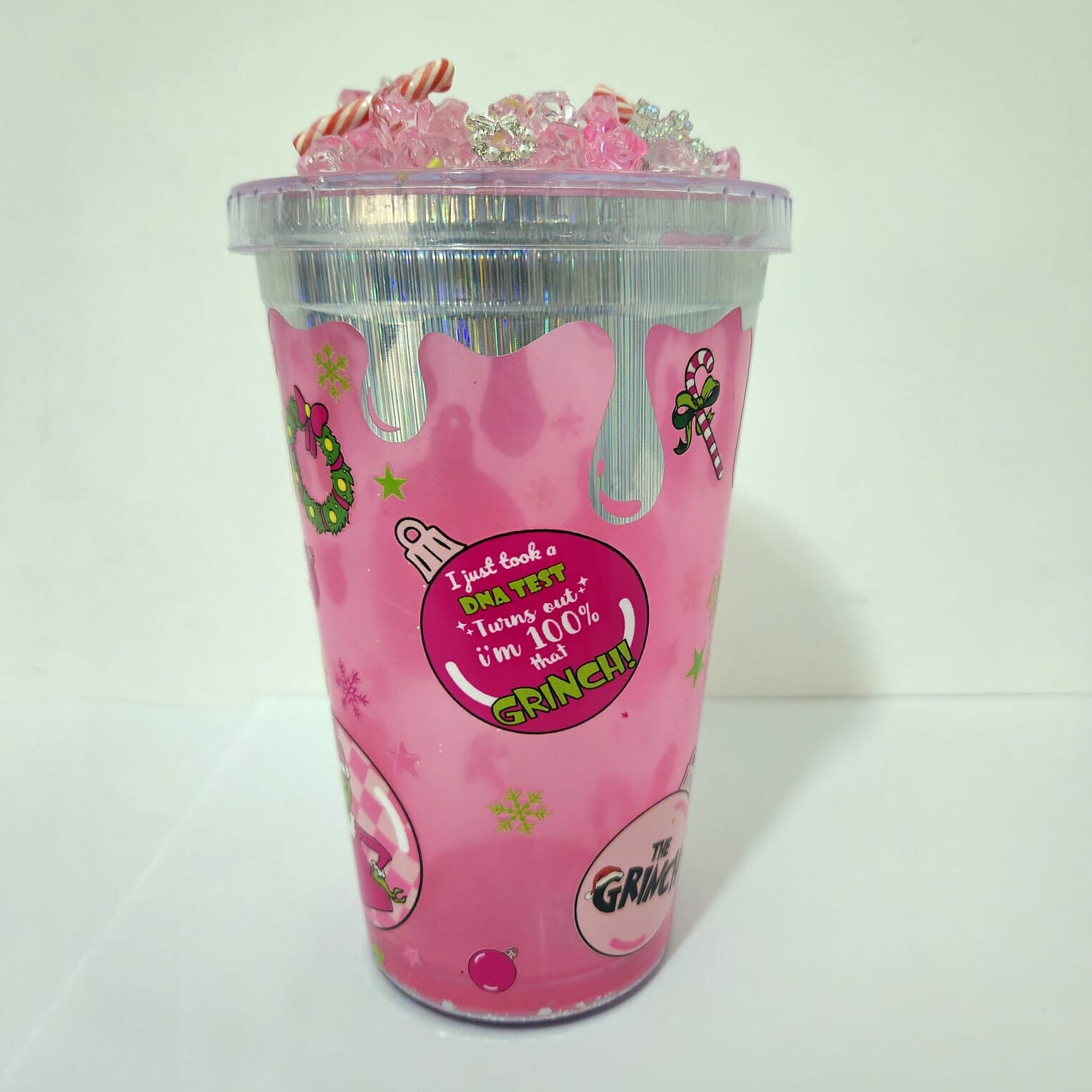 16oz The grinch pink shimmer tumbler with a silver drip and Custom lid