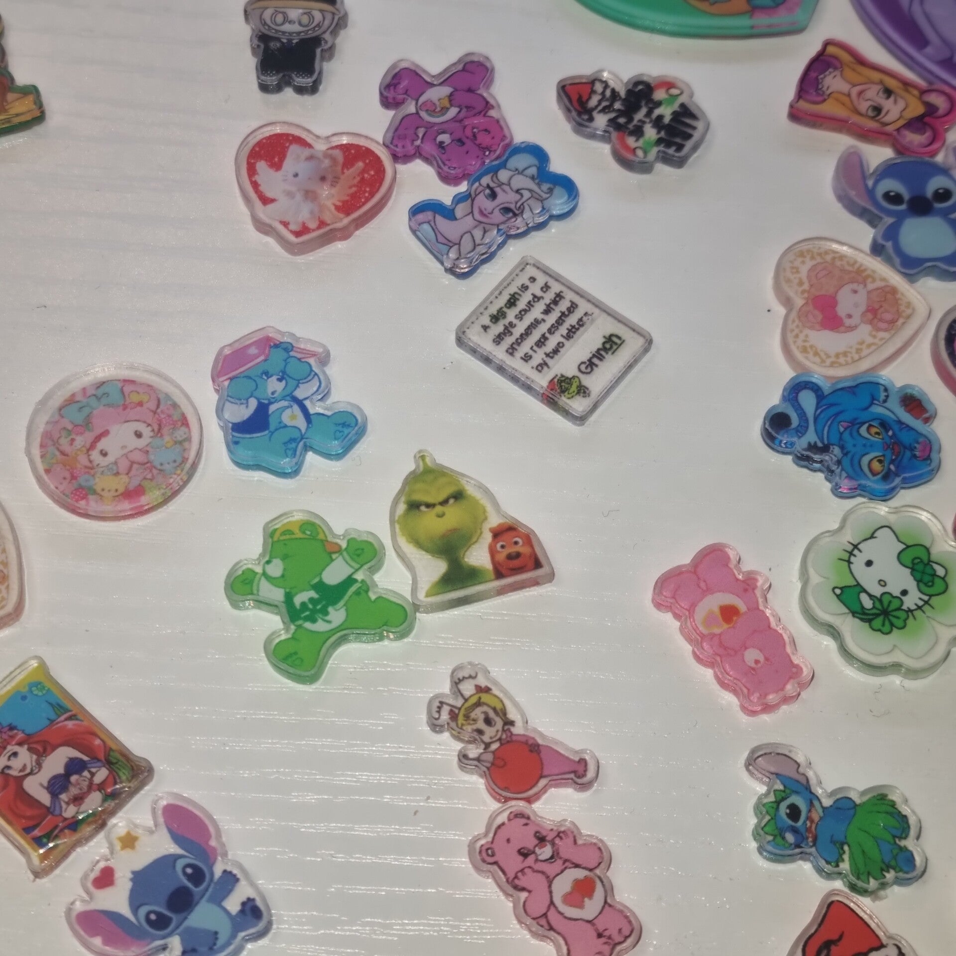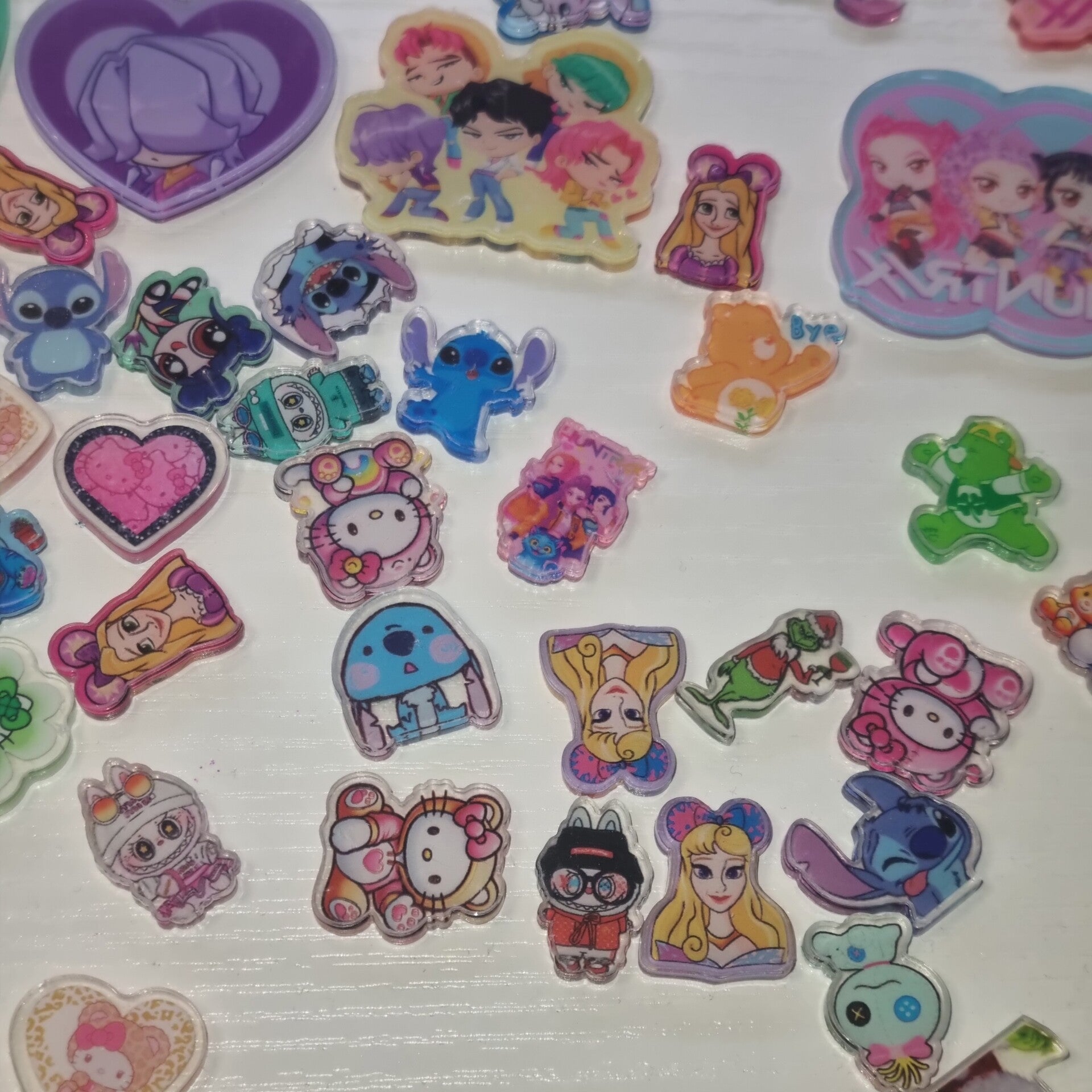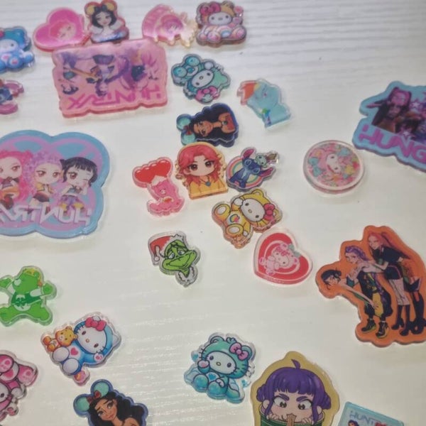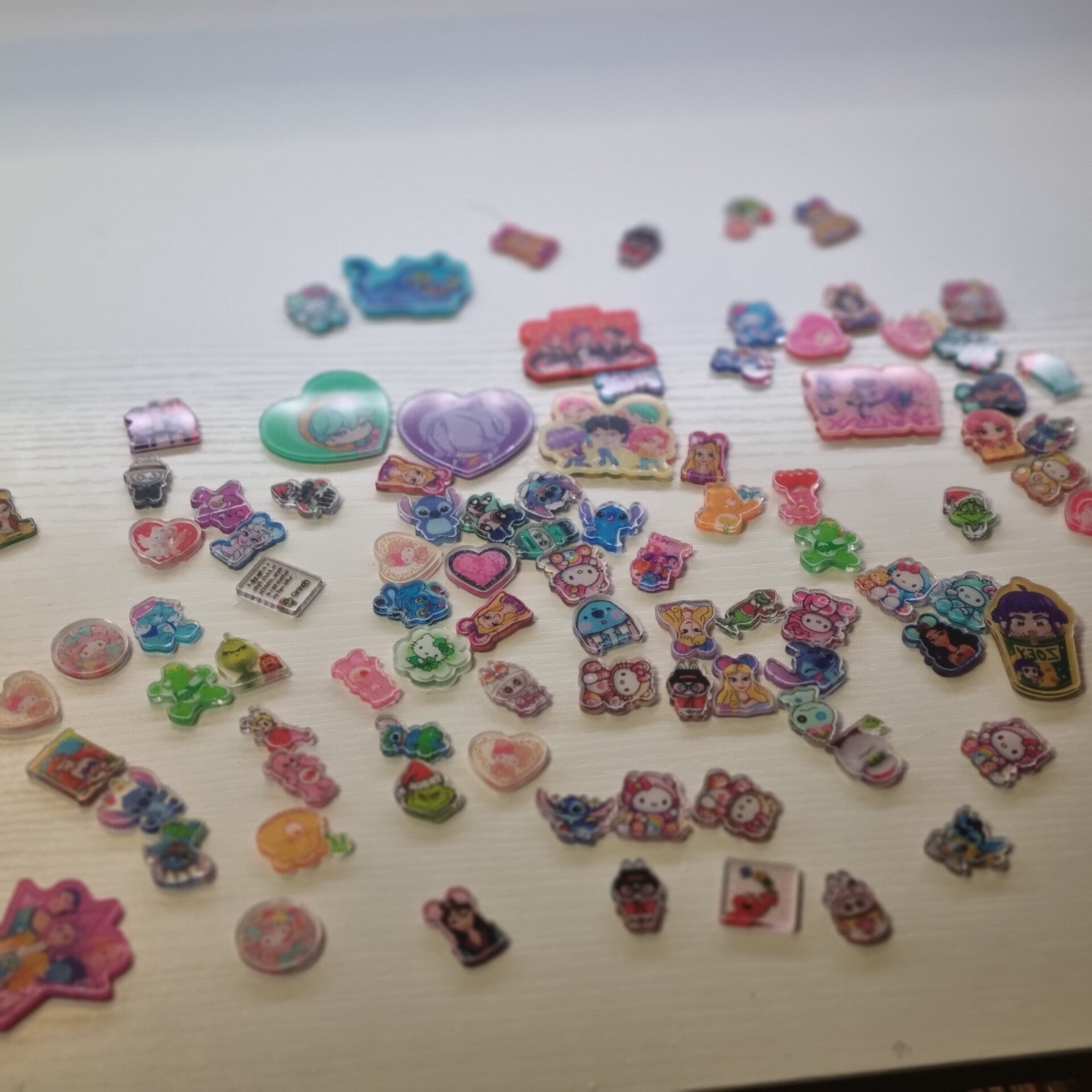 The bag includes at least 100 if not more acrylic charms - medium sized (1 inch) and small sized (2cm). Perfect for using on custom tumbler lids, phone cases etc. Includes Disney, hello kitty, care bears, the grinch, labubu and kpop demon hunter designs.